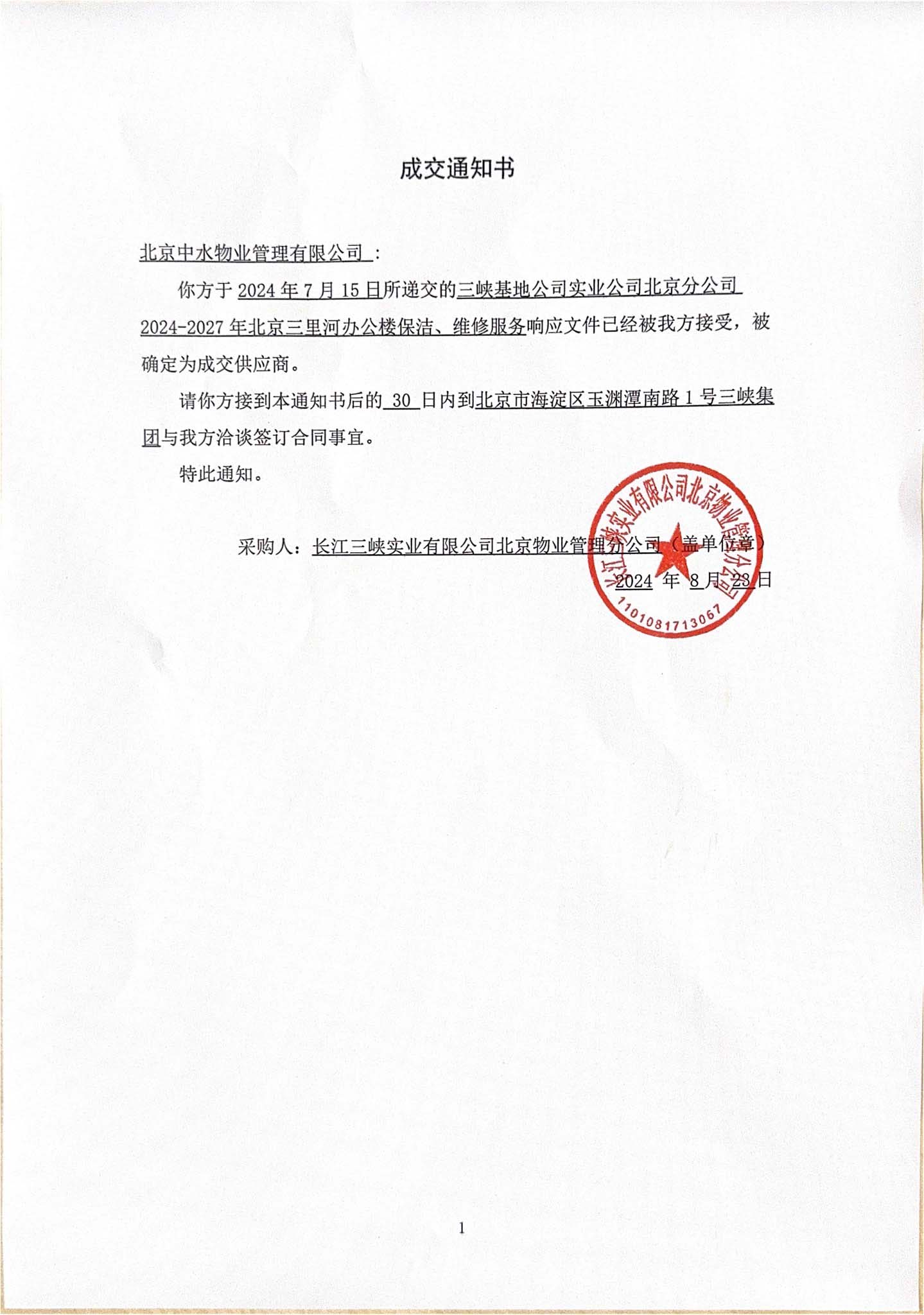 中水物业成功中标三峡实业北京分公司北京三里河办公楼保洁、维修服务项目