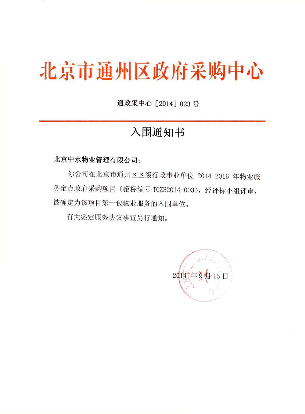 成功入围北京市通州区区级行政事业单位2014-2016年度物业服务定点采购供应商