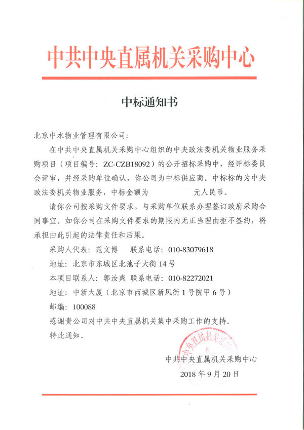 中央政法委机关物业服务采购项目成功中标
