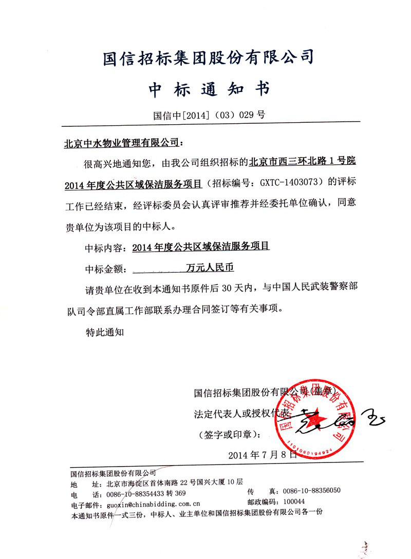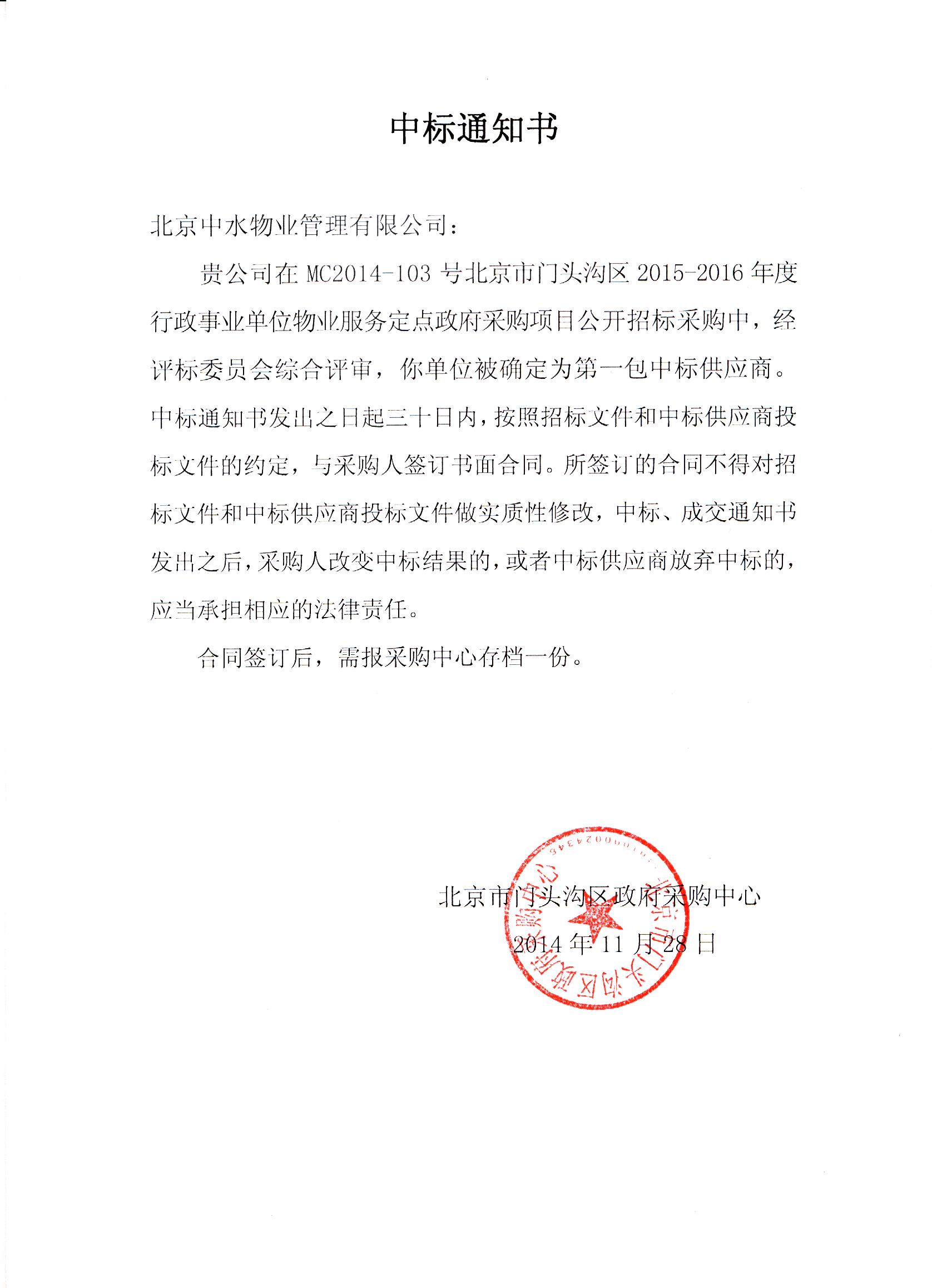 成功入围北京市通州区区级行政事业单位2014-2016年度物业服务定点采购供应商